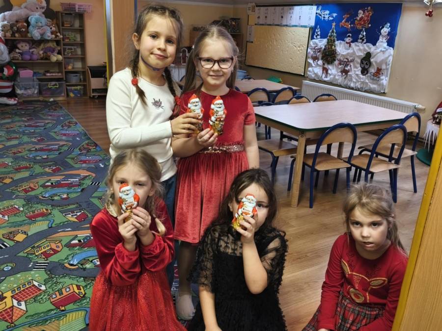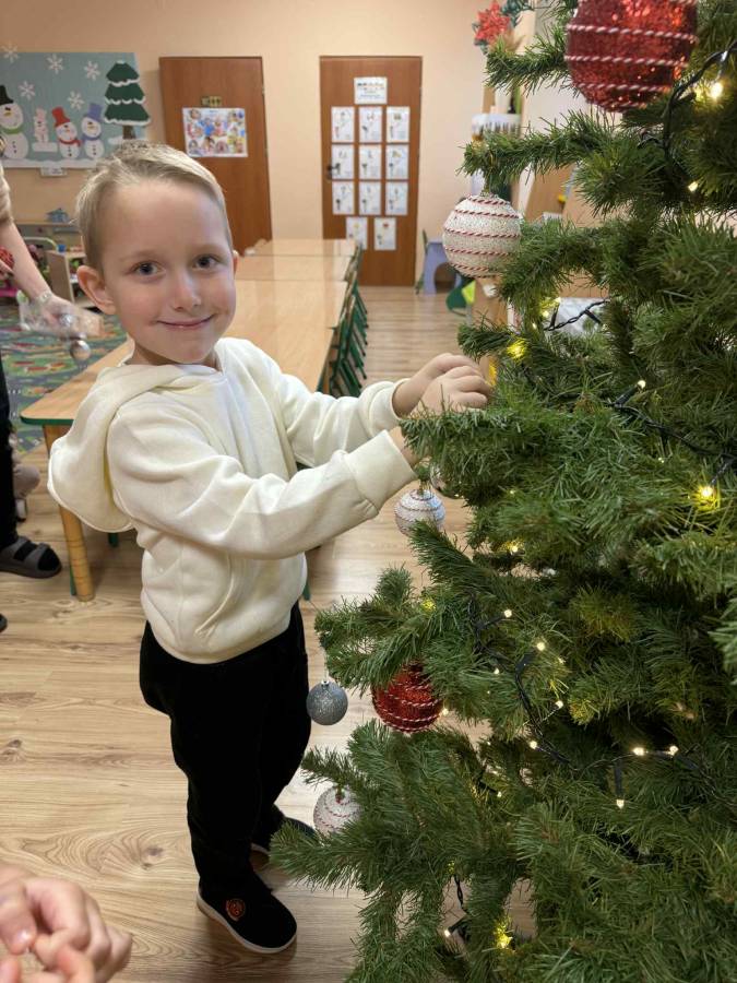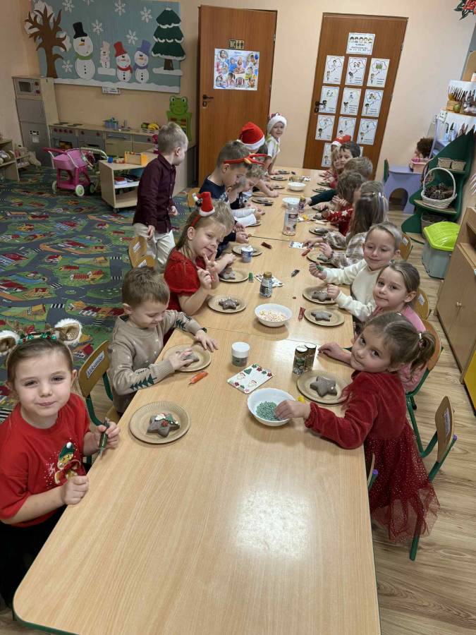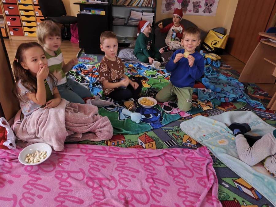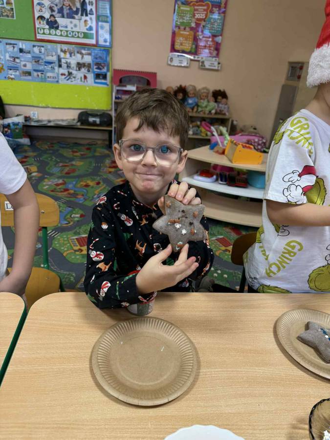 Mikołajki w naszym przedszkolu upłynęły w prawdziwie magicznej atmosferze! Już od rana w salach unosił się zapach świąt, a dzieci z wielkim entuzjazmem włączyły się we wspólne przygotowania. Najpierw czekało na nie ubieranie grupowych choinek- każdy przedszkolak zawieszał wybraną ozdobę, dzięki czemu drzewka stały się kolorowe, niepowtarzalne i pełne dziecięcej radości. W niektórych grupach odbyło się również dekorowanie świątecznych pierników. Dzieci ozdabiały je kolorowymi lukrami, posypkami i czekoladowymi drobinkami. Podczas pracy było dużo śmiechu, rozmów i świątecznych piosenek w tle, a gotowe pierniki wyglądały jak małe dzieła sztuki i smakowały równie dobrze! Po słodkich aktywnościach przyszedł czas na chwilę relaksu. W salach zrobiło się przytulnie: na podłodze pojawiły się miękkie poduszki, koce i pudełeczka z popcornem, a dzieci mogły wygodnie ułożyć się, by wspólnie obejrzeć świąteczne bajki. Magiczne światła choinki i bajkowe historie wprowadziły wszystkich w wyjątkowy, mikołajkowy nastrój.