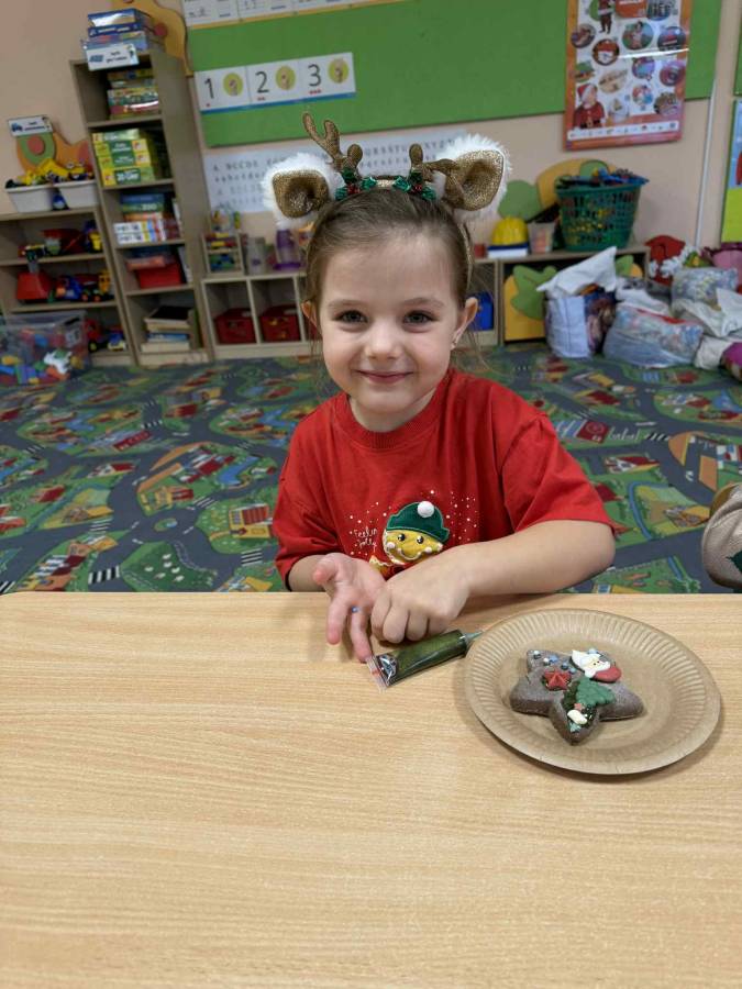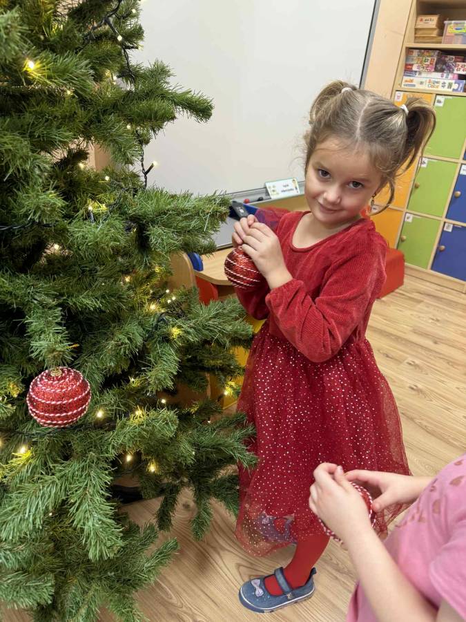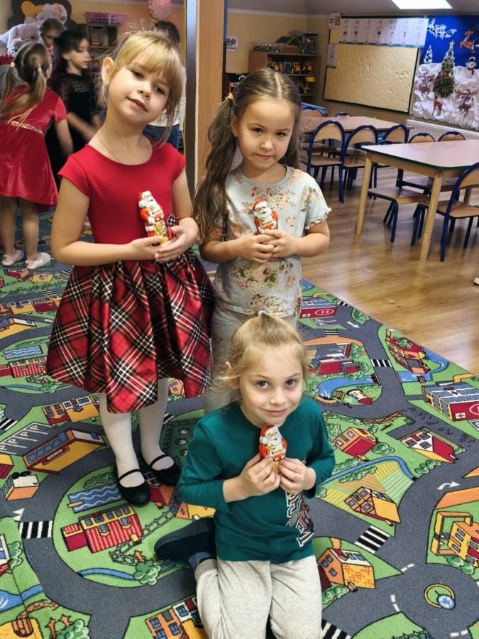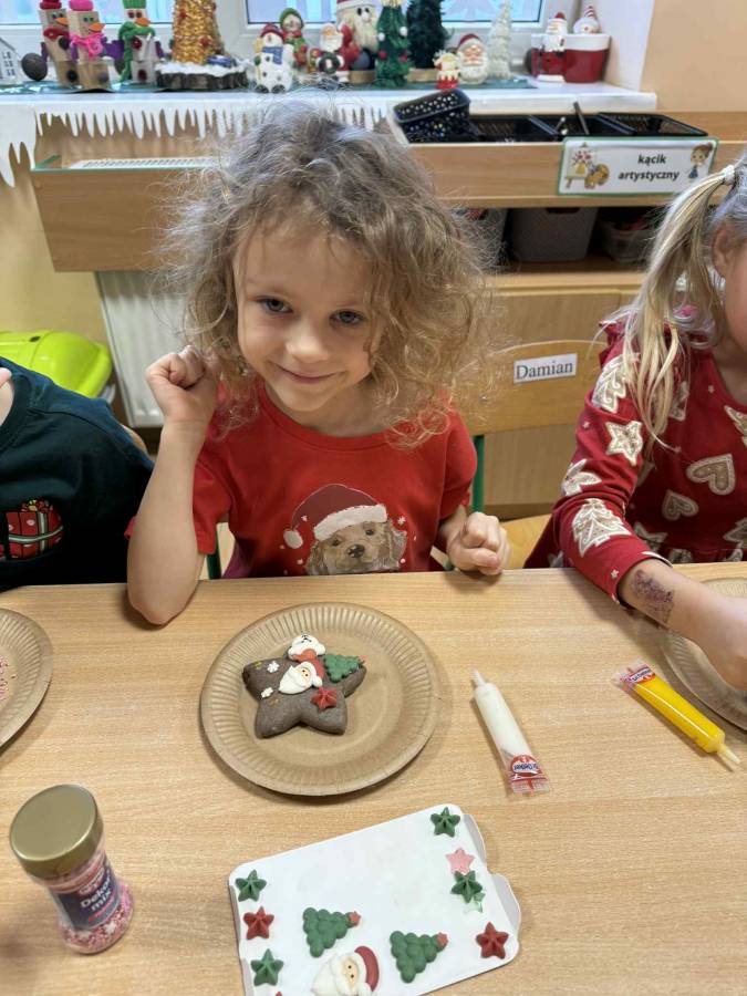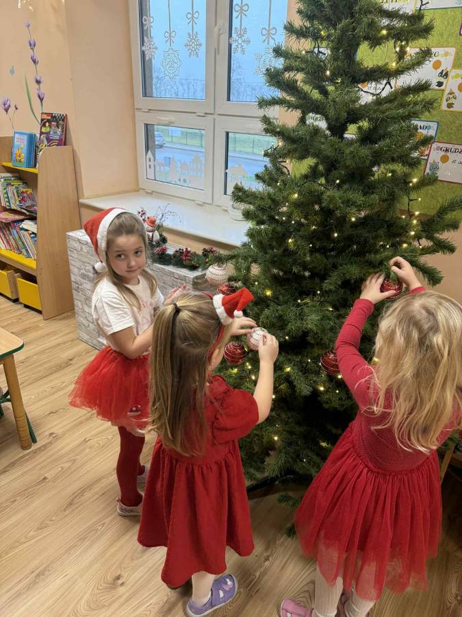 Mikołajki w naszym przedszkolu upłynęły w prawdziwie magicznej atmosferze! Już od rana w salach unosił się zapach świąt, a dzieci z wielkim entuzjazmem włączyły się we wspólne przygotowania. Najpierw czekało na nie ubieranie grupowych choinek- każdy przedszkolak zawieszał wybraną ozdobę, dzięki czemu drzewka stały się kolorowe, niepowtarzalne i pełne dziecięcej radości. W niektórych grupach odbyło się również dekorowanie świątecznych pierników. Dzieci ozdabiały je kolorowymi lukrami, posypkami i czekoladowymi drobinkami. Podczas pracy było dużo śmiechu, rozmów i świątecznych piosenek w tle, a gotowe pierniki wyglądały jak małe dzieła sztuki i smakowały równie dobrze! Po słodkich aktywnościach przyszedł czas na chwilę relaksu. W salach zrobiło się przytulnie: na podłodze pojawiły się miękkie poduszki, koce i pudełeczka z popcornem, a dzieci mogły wygodnie ułożyć się, by wspólnie obejrzeć świąteczne bajki. Magiczne światła choinki i bajkowe historie wprowadziły wszystkich w wyjątkowy, mikołajkowy nastrój.