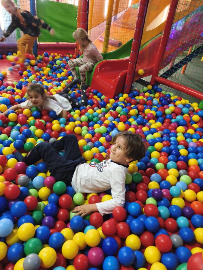 Po wejściu na salę zabaw wszyscy z ogromnym entuzjazmem korzystali z dostępnych atrakcji. Na dzieci czekały m.in. mini pojazdy, dmuchane skakańce, basen z piłeczkami, zjeżdżalnie oraz karuzela z konikami. Największą radość sprawiła przedszkolakom ogromna konstrukcja składająca się z labiryntu rur, przejść, tuneli, basenów z piłeczkami i zjeżdżalni, pozwalająca na aktywne, bezpieczne i radosne szaleństwo.