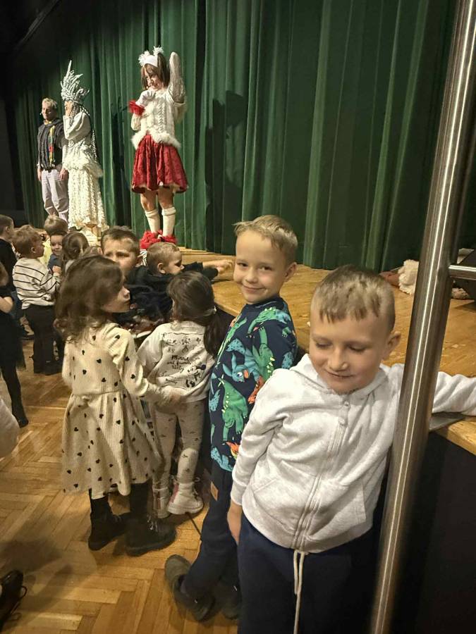 9 grudnia dzieci z grupy Misie i Krasnale udały się na wycieczkę do Teatru Muzycznego Voice w Płocku na musical Królowa Śniegu. Po przybyciu na miejsce przedszkolaki zostały serdecznie powitane przez zespół teatru i zajęły miejsca na widowni. Musical Królowa Śniegu urzekł dzieci barwną scenografią, nastrojową muzyką oraz pięknymi kostiumami. Mali widzowie z zapartym tchem śledzili losy Gerdy i Kaja, reagując żywo na dynamiczne sceny i wesołe piosenki. Po przedstawieniu na dzieci czekała kolejna atrakcja- udział w warsztatach muzyczno- tanecznych prowadzonych przez aktorów występujących w musicalu. Przedszkolaki miały okazję nauczyć się fragmentów piosenek z przedstawienia oraz poznać kilka prostych choreografii. Warsztaty okazały się fantastyczną zabawą: dzieci śpiewały, tańczyły i z dużym zaangażowaniem naśladowały teatralne ruchy wykonawców.