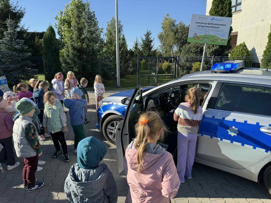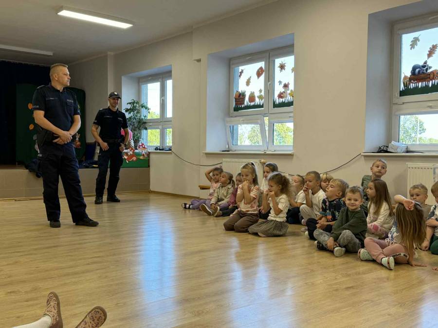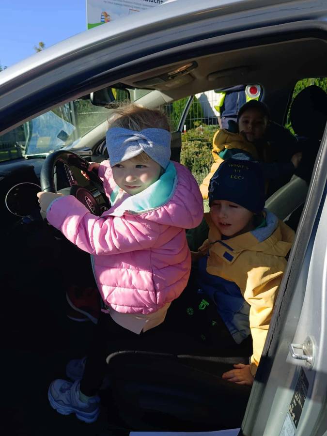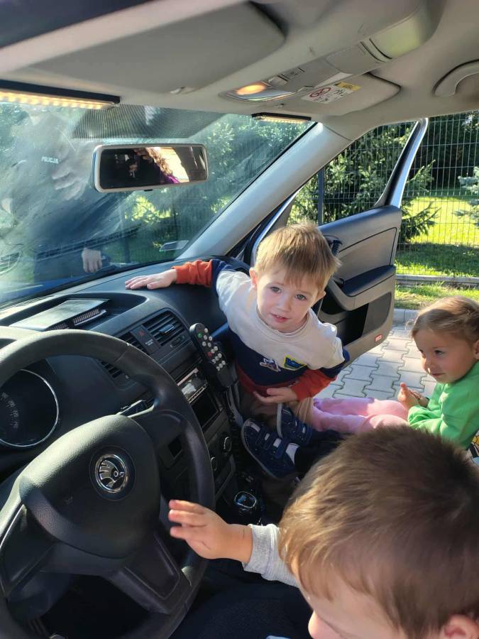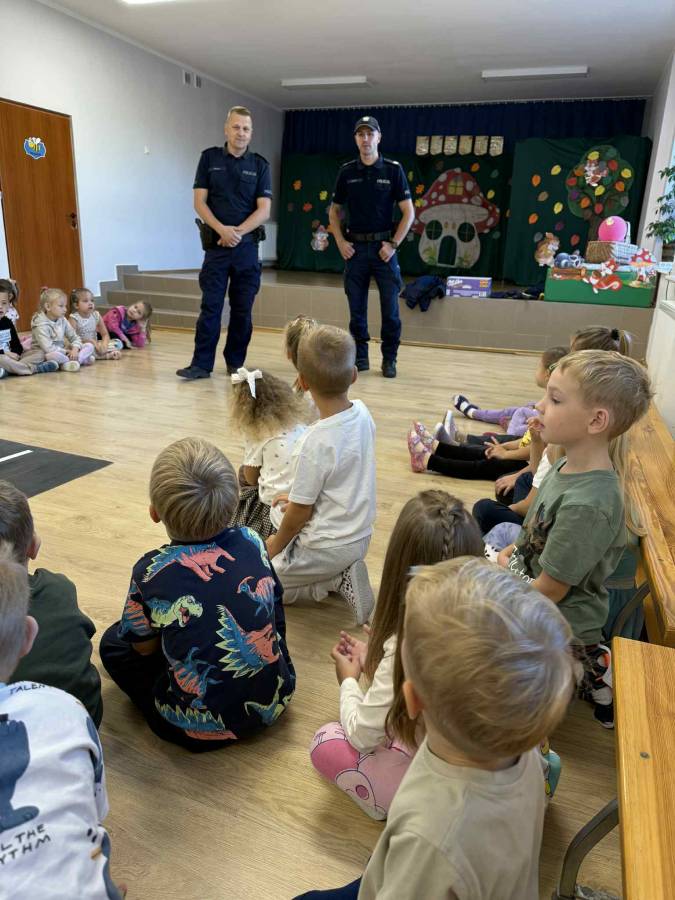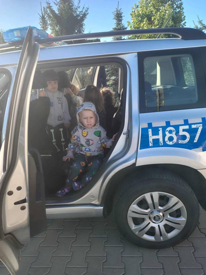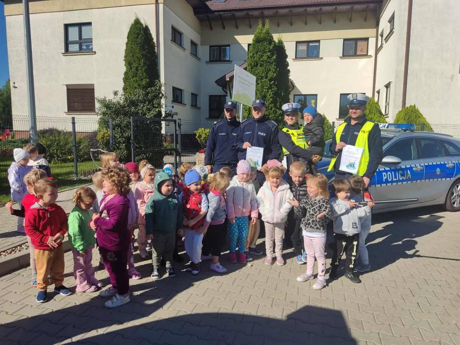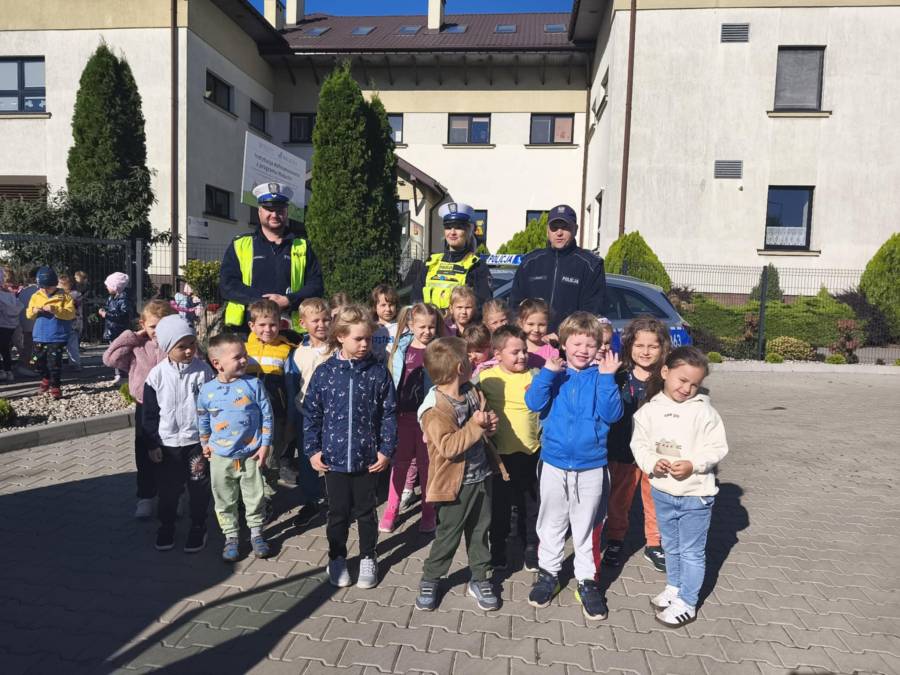 25 września w czwartek w naszym przedszkolu odbyło się spotkanie z policjantami. Głównym celem wizyty było przypomnienie podstawowych zasad bezpieczeństwa oraz zapoznanie z zawodem policjanta. Nasi goście przybliżyli dzieciom podstawowe zasady bezpiecznego poruszania się po drogach oraz przypomnieli numery alarmowe. Nasze przedszkolaki dowiedziały się, jak bezpiecznie podróżować, jak ważne jest zapinanie pasów bezpieczeństwa podczas jazdy samochodem. Panowie Policjanci nawiązali również do konieczności noszenia ubrań posiadających elementy odblaskowe. Podczas spotkania przedszkolaki zadawały pytania oraz dzieliły się swoimi doświadczeniami. Dużym zainteresowaniem cieszyła się prezentacja ubioru i wyposażenia policyjnego, niezbędnego podczas wykonywania pracy policjanta. Dużą atrakcją były radiowozy policyjne. Dzieci mogły je obejrzeć, usiąść na siedzeniach, wykonać pamiątkowe zdjęcie. Jednak najwięcej radości wzbudziło włączenie policyjnych syren.