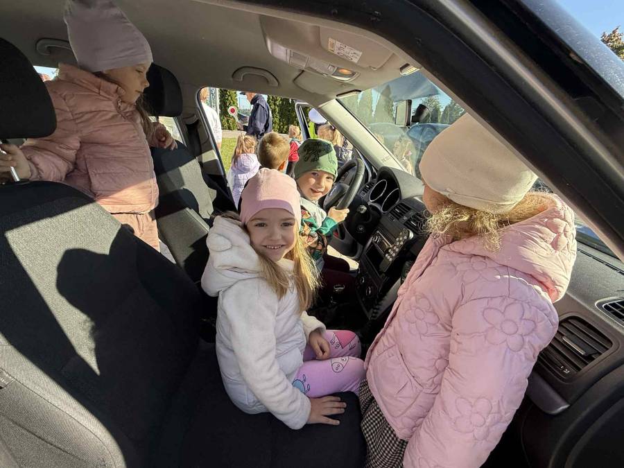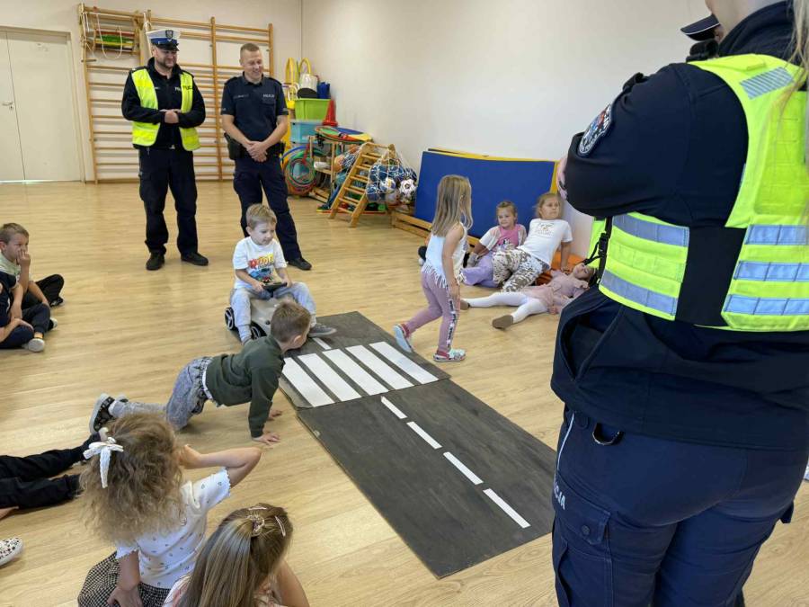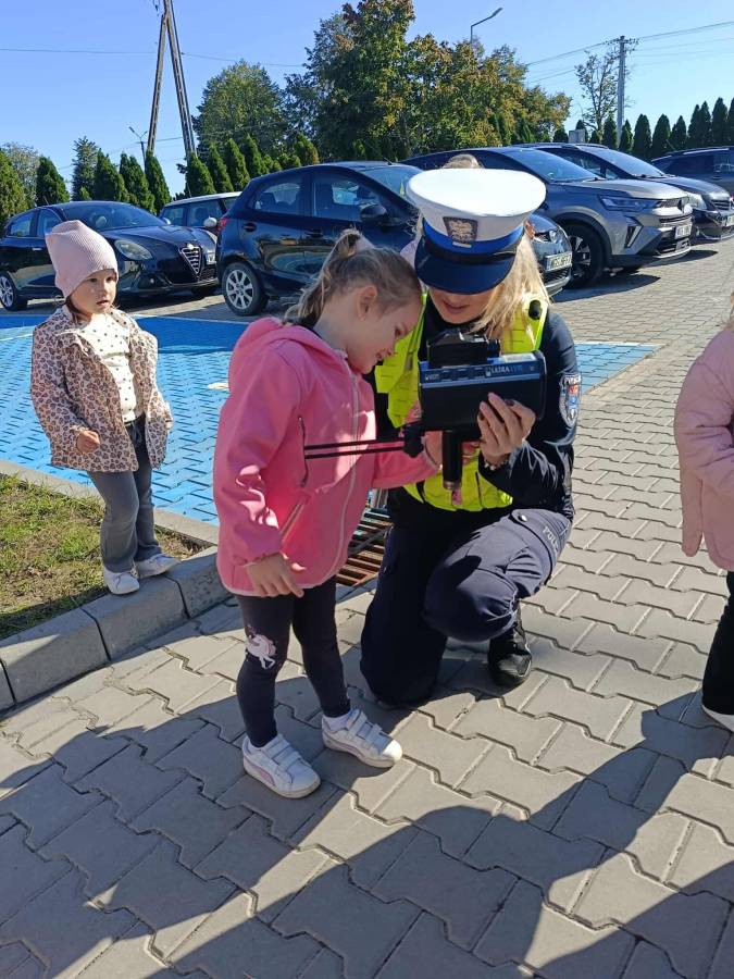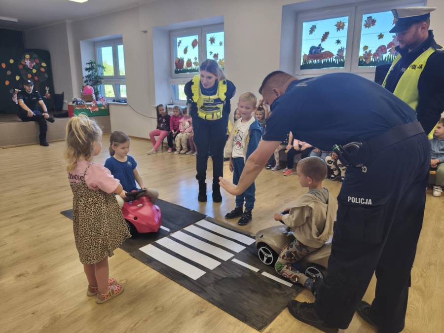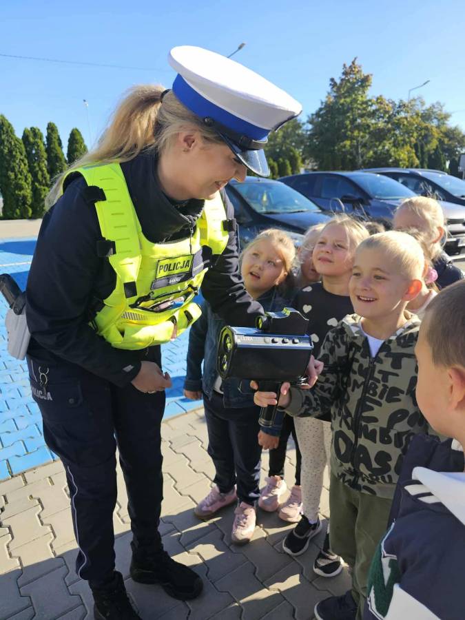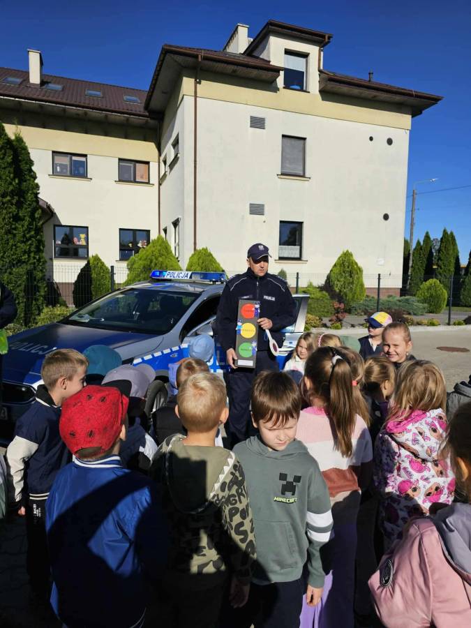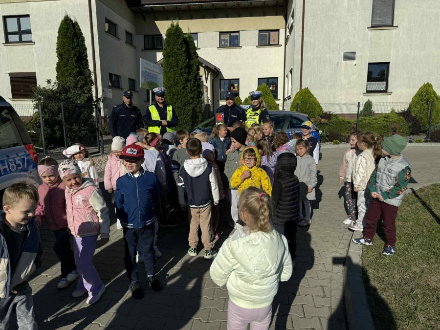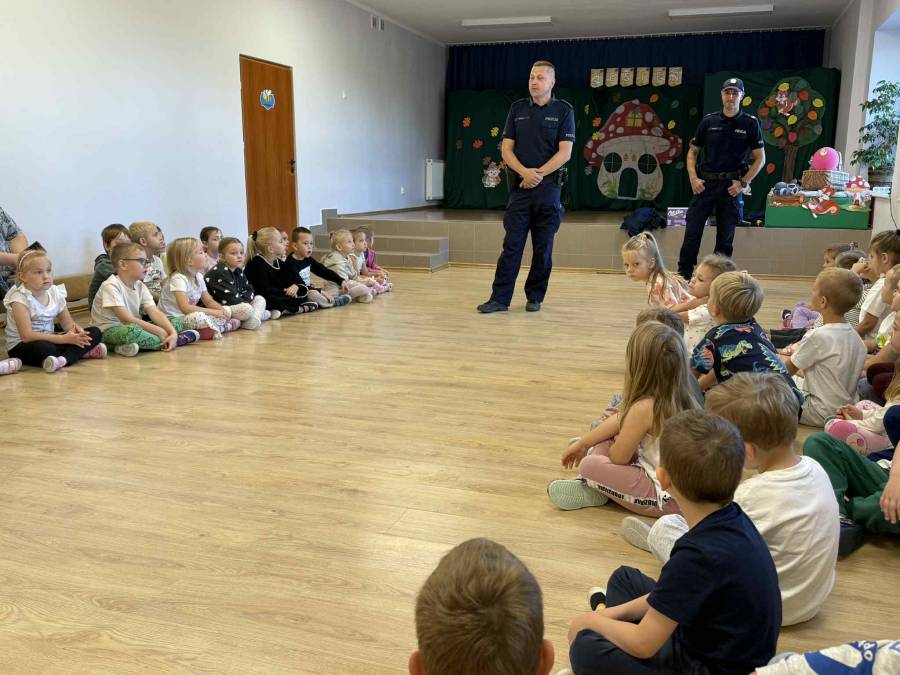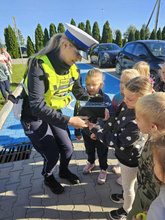 25 września w czwartek w naszym przedszkolu odbyło się spotkanie z policjantami. Głównym celem wizyty było przypomnienie podstawowych zasad bezpieczeństwa oraz zapoznanie z zawodem policjanta. Nasi goście przybliżyli dzieciom podstawowe zasady bezpiecznego poruszania się po drogach oraz przypomnieli numery alarmowe. Nasze przedszkolaki dowiedziały się, jak bezpiecznie podróżować, jak ważne jest zapinanie pasów bezpieczeństwa podczas jazdy samochodem. Panowie Policjanci nawiązali również do konieczności noszenia ubrań posiadających elementy odblaskowe. Podczas spotkania przedszkolaki zadawały pytania oraz dzieliły się swoimi doświadczeniami. Dużym zainteresowaniem cieszyła się prezentacja ubioru i wyposażenia policyjnego, niezbędnego podczas wykonywania pracy policjanta. Dużą atrakcją były radiowozy policyjne. Dzieci mogły je obejrzeć, usiąść na siedzeniach, wykonać pamiątkowe zdjęcie. Jednak najwięcej radości wzbudziło włączenie policyjnych syren.