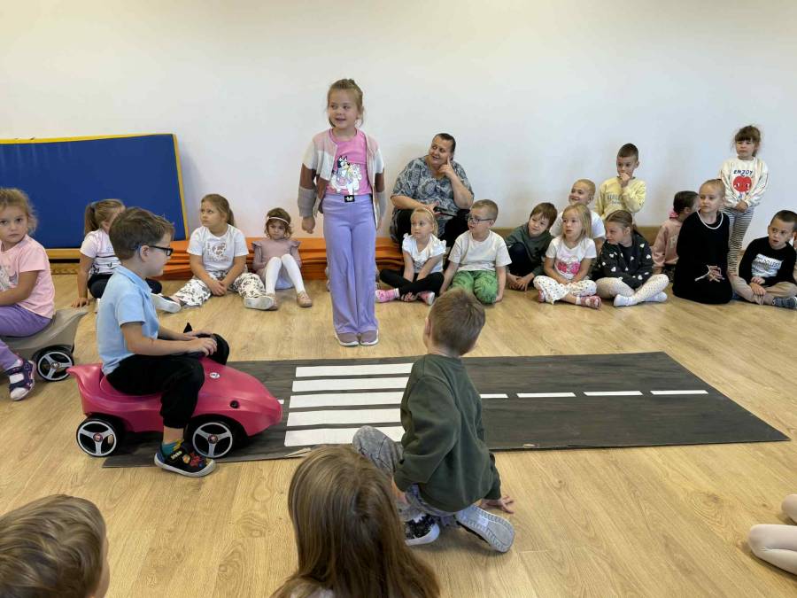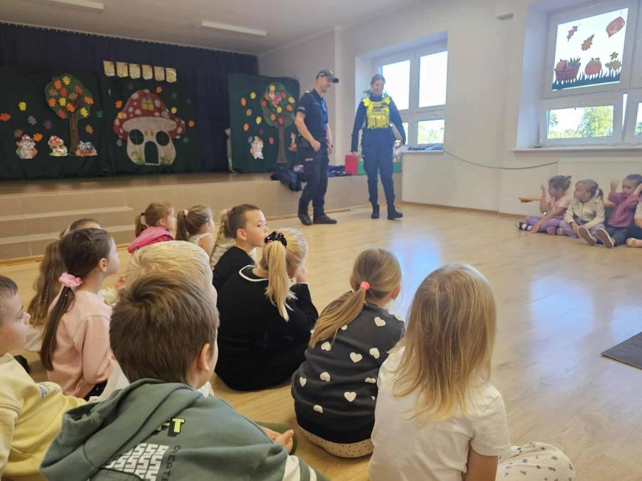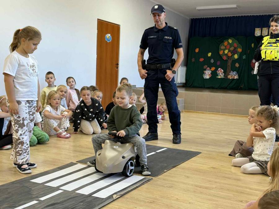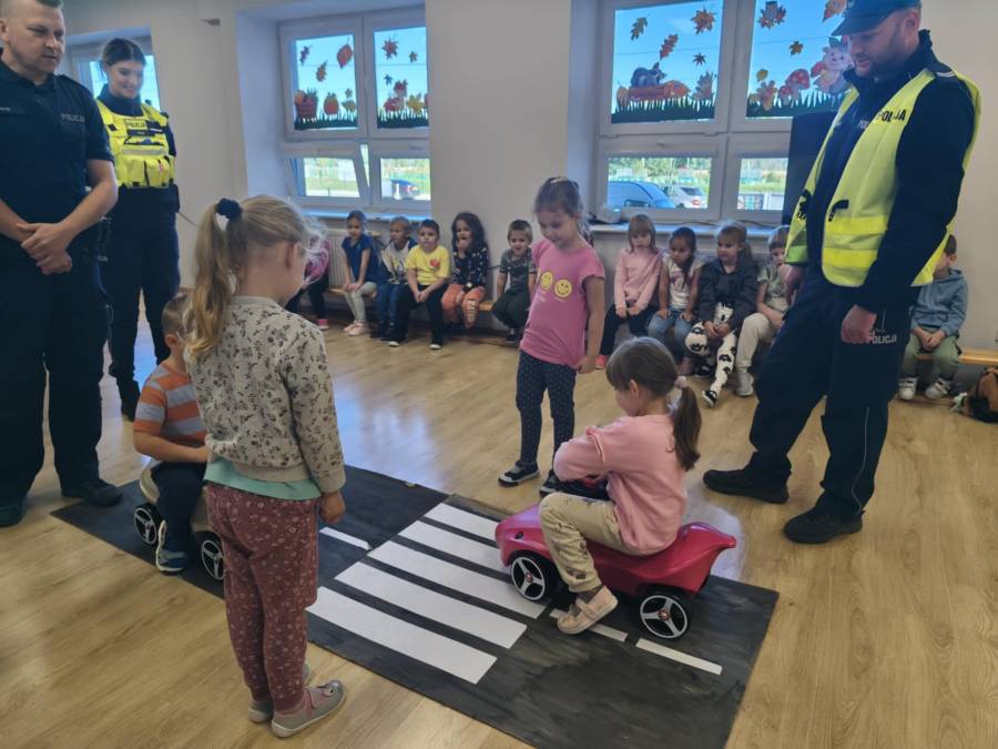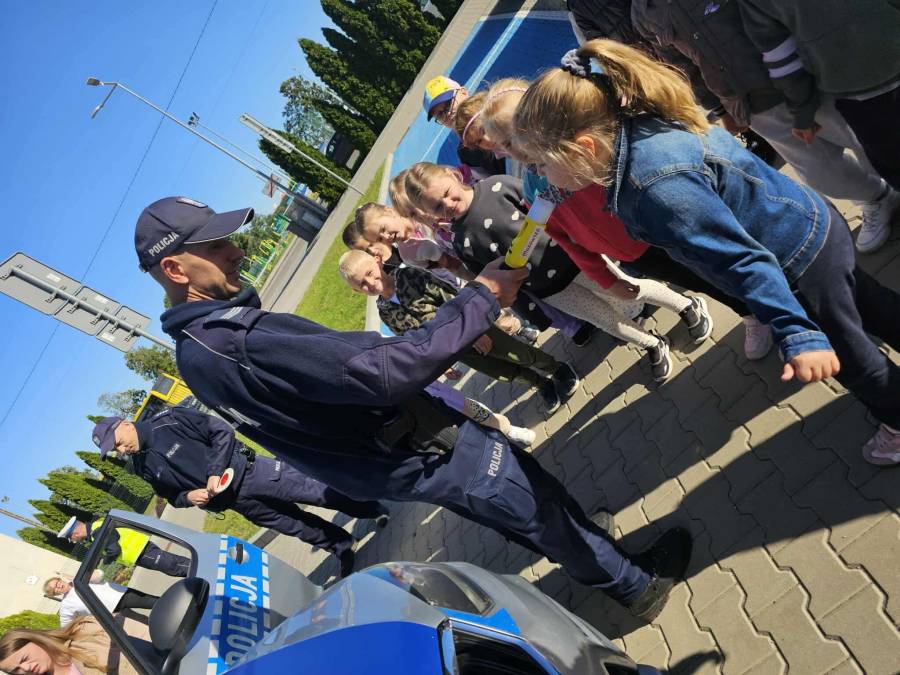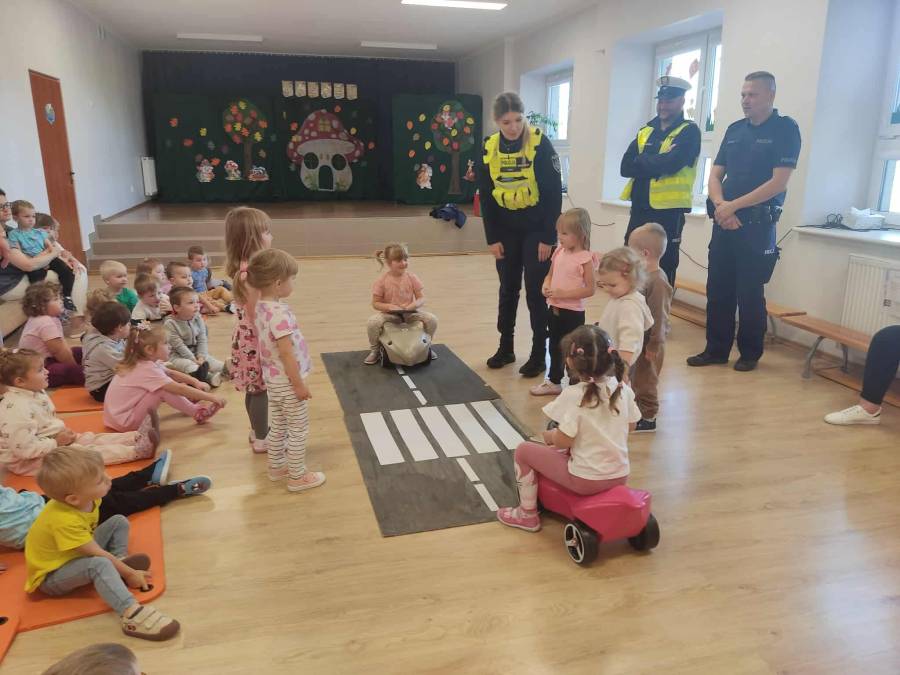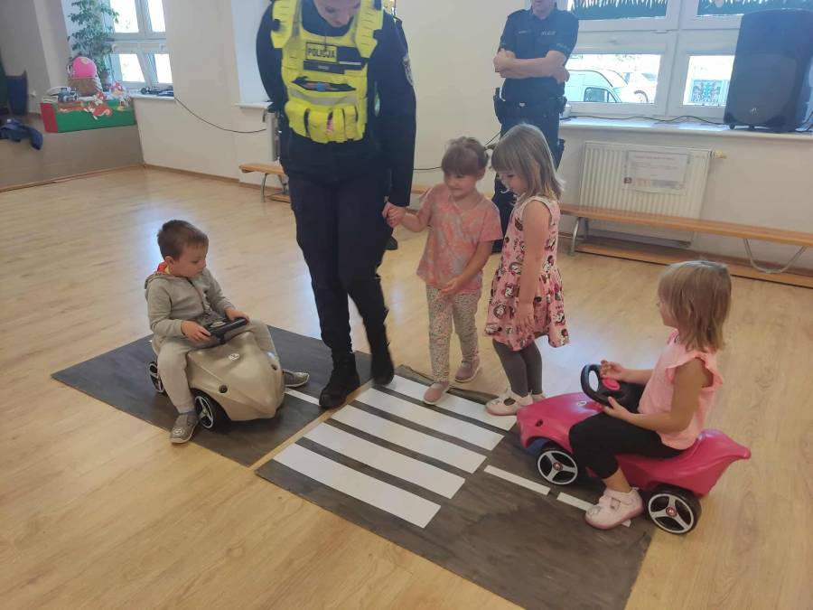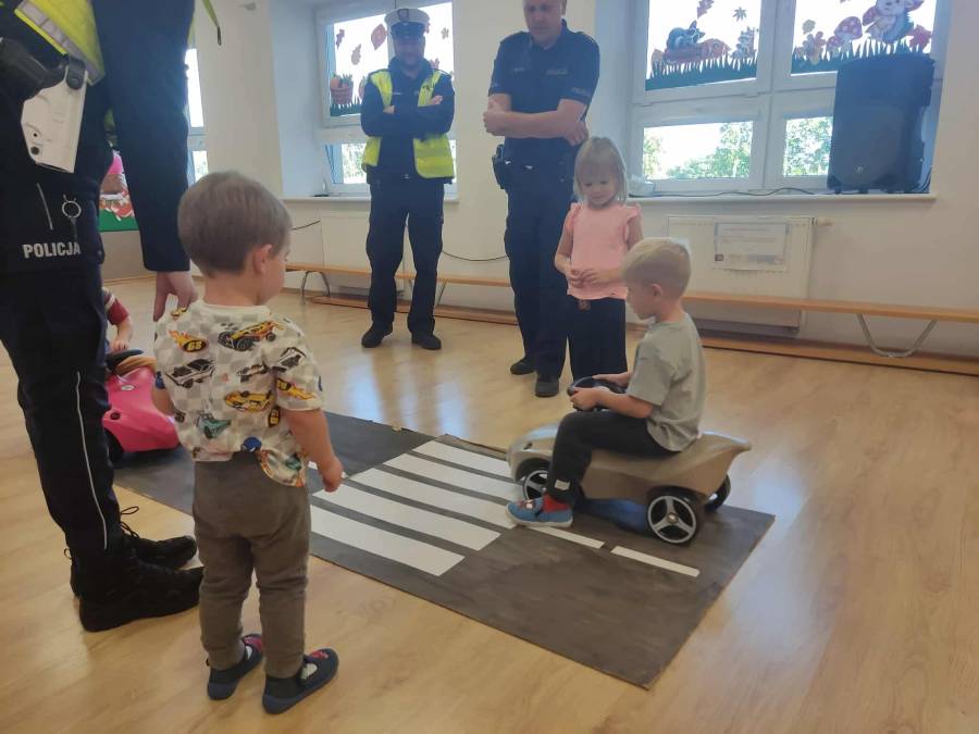 25 września w czwartek w naszym przedszkolu odbyło się spotkanie z policjantami. Głównym celem wizyty było przypomnienie podstawowych zasad bezpieczeństwa oraz zapoznanie z zawodem policjanta. Nasi goście przybliżyli dzieciom podstawowe zasady bezpiecznego poruszania się po drogach oraz przypomnieli numery alarmowe. Nasze przedszkolaki dowiedziały się, jak bezpiecznie podróżować, jak ważne jest zapinanie pasów bezpieczeństwa podczas jazdy samochodem. Panowie Policjanci nawiązali również do konieczności noszenia ubrań posiadających elementy odblaskowe. Podczas spotkania przedszkolaki zadawały pytania oraz dzieliły się swoimi doświadczeniami. Dużym zainteresowaniem cieszyła się prezentacja ubioru i wyposażenia policyjnego, niezbędnego podczas wykonywania pracy policjanta. Dużą atrakcją były radiowozy policyjne. Dzieci mogły je obejrzeć, usiąść na siedzeniach, wykonać pamiątkowe zdjęcie. Jednak najwięcej radości wzbudziło włączenie policyjnych syren.