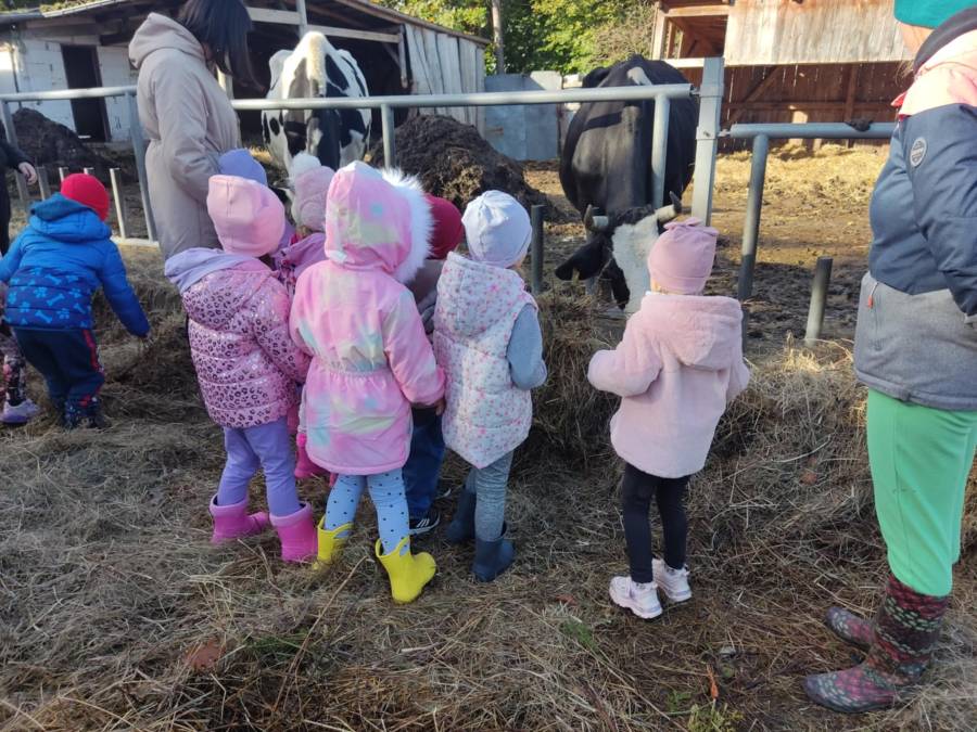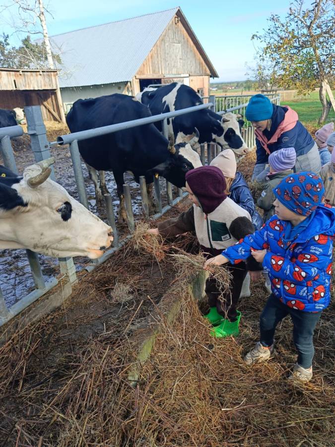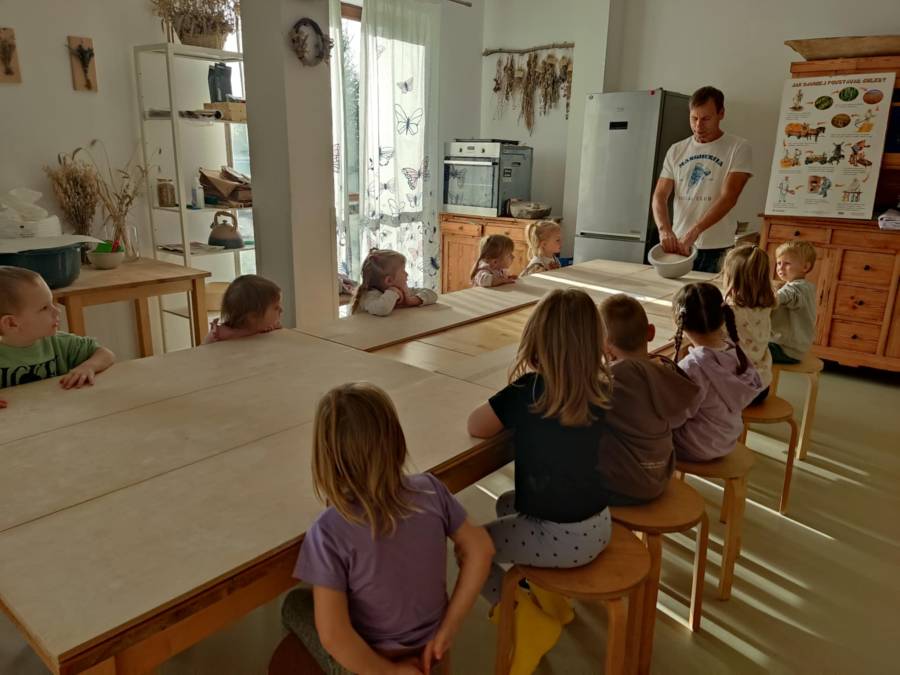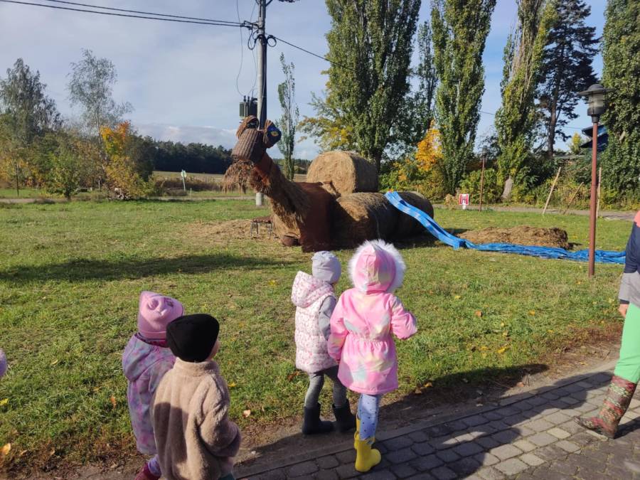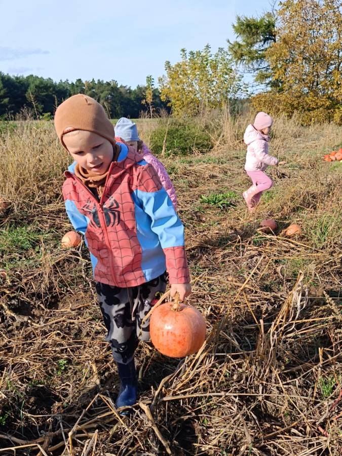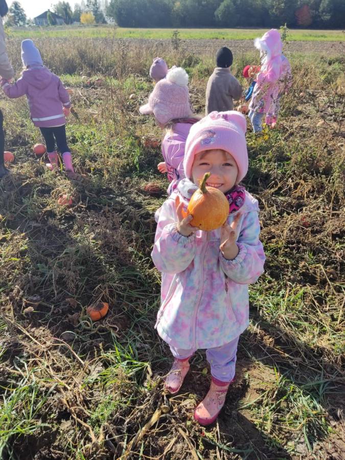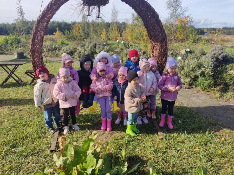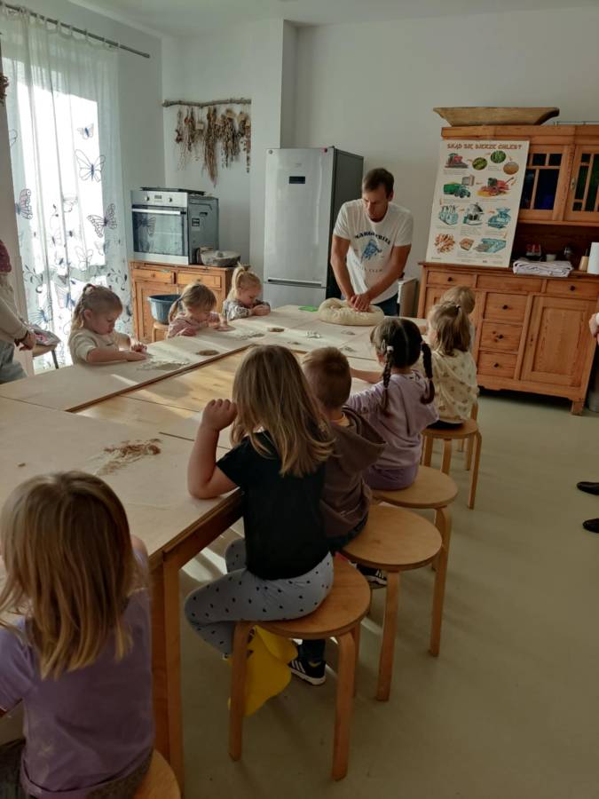 W dniu dzisiejszym grupy Smerfy i Misie udały się na wycieczkę do Stowarzyszenia Ekologiczno-Kulturalnego w Grzybowie. Dzieci wysłuchały ciekawej opowieści o tradycyjnym pieczeniu chleba, a następnie samodzielnie formowały i piekły pyszne bułeczki. Podczas zwiedzania gospodarstwa mogły zobaczyć różne zwierzęta i dowiedzieć się, jak wygląda ich codzienne życie. Na uczestników czekało również drugie śniadanie przygotowane z lokalnych produktów oraz wspaniała zabawa na placu zabaw. Na zakończenie dzieci brały udział w zbieraniu dyń, co sprawiło im wiele radości.