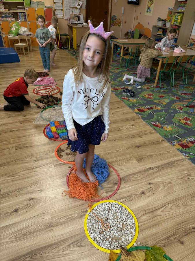 W naszym przedszkolu odbył się niezwykle ciekawy i radosny ,,Dzień bez skarpetek". Dzieci z grupy Krasnale tego dnia zdjęły skarpetki, by odkrywać świat za pomocą stóp! Na sali przygotowana została specjalna ścieżka sensoryczna, po której przedszkolaki chodziły boso, poznając różne faktury i struktury. Na trasie znalazły się m.in. miękkie liście, kłujące szyszki, chłodne kamyczki, strzelająca folia bąbelkowa, pucha włóczka, pachnąca lasem kora drzew itp. Dzieci z ogromną ciekawością i radością sprawdzały, co kryje się pod ich stopami, porównywały wrażenia i uczyły się opisywać swoje odczucia. Nie zabrakło również zabaw ruchowych, masażyków stóp i relaksu przy spokojnej muzyce.