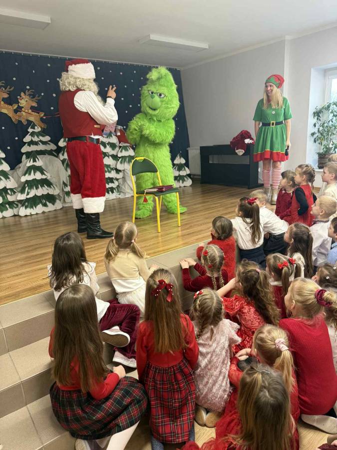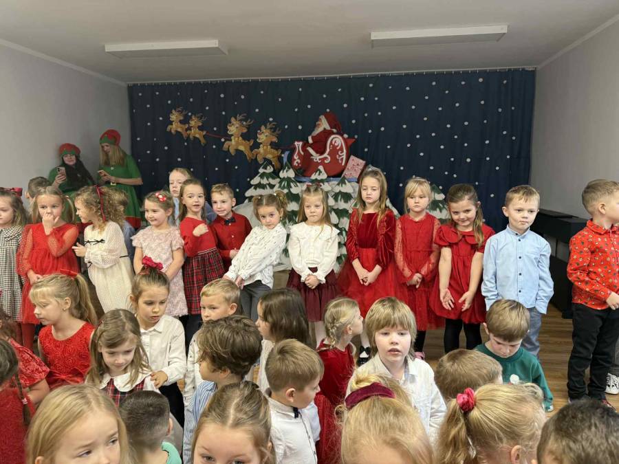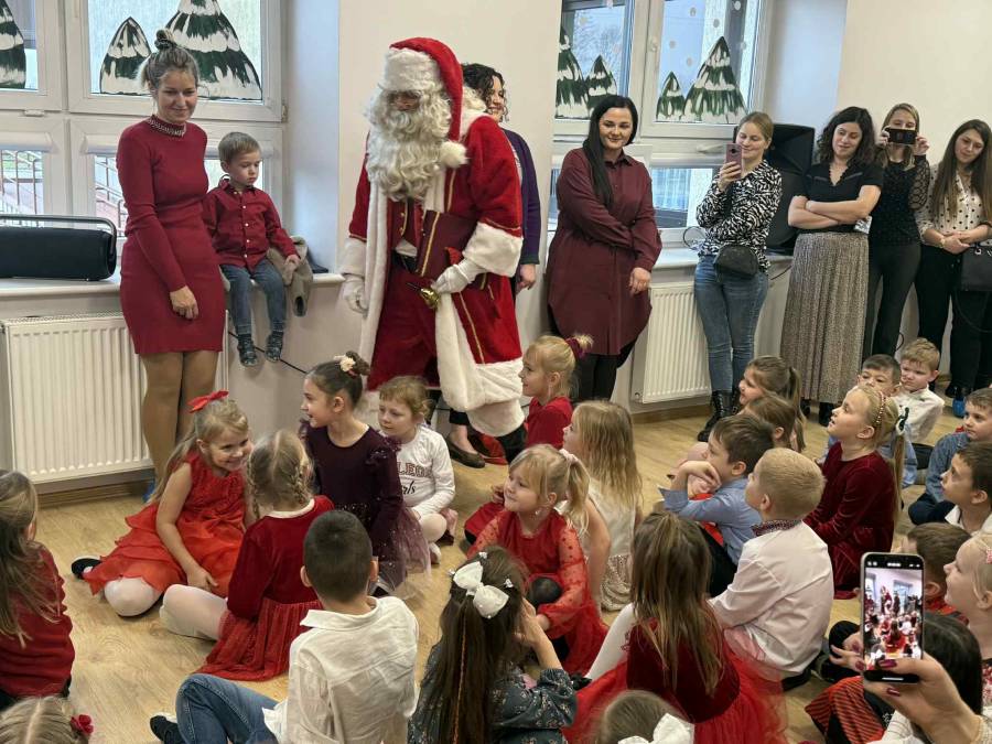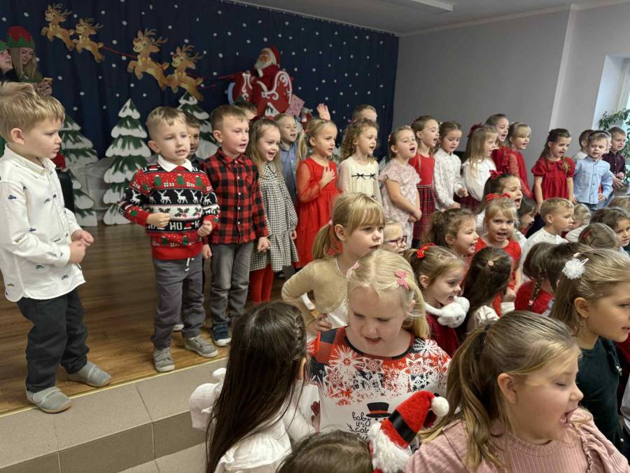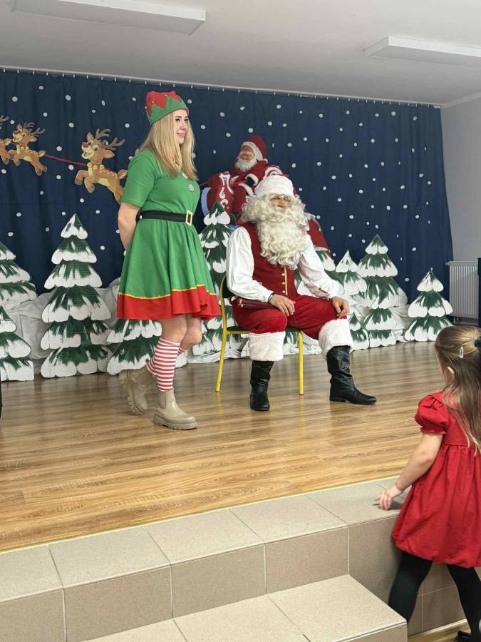 Podczas świątecznego spotkania na scenie wystąpiły przedszkolaki, które z wielkim zaangażowaniem zaprezentowały świąteczne piosenki oraz tradycyjne kolędy. Mali artyści wzruszyli i zachwycili publiczność, wprowadzając wszystkich w wyjątkowy, bożonarodzeniowy nastrój. Po występach dzieci wzięły udział w radosnych animacjach prowadzonych przez wesołe elfy. Były wspólne tańce, zabawy ruchowe oraz śmiech, który rozbrzmiewał w całej sali. Niespodzianką dla najmłodszych było także spotkanie ze Świętym Mikołajem, który serdecznie przywitał dzieci, rozmawiał z nimi i zostawił drobne upominki. Dodatkową atrakcją okazało się pojawienie Grincha, który początkowo próbował ukraść świąteczny nastrój, jednak dzięki radości i życzliwości dzieci szybko dołączył do wspólnej zabawy. Spotkanie przebiegło w ciepłej, radosnej atmosferze i na długo pozostanie w pamięci uczestników jako wyjątkowe, pełne magii świąt wydarzenie.